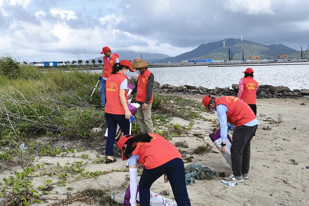 活动中,党员、志愿者们分工合作、互相配合,在阳江港19#码头外沿海滩清理海洋垃圾。他们身穿红马甲,迎着海风,顶着烈日,手持编织袋、垃圾夹等清理工具,不怕脏、不怕累,认真捡拾海岸边的饮料瓶、塑料制品、泡沫箱、破渔网和其他小型废物品,一个个忙碌的身影成为了海边最亮丽的风景线。