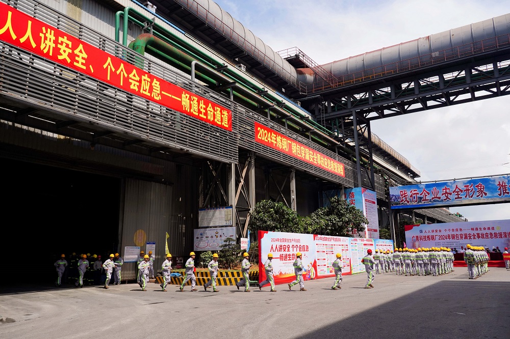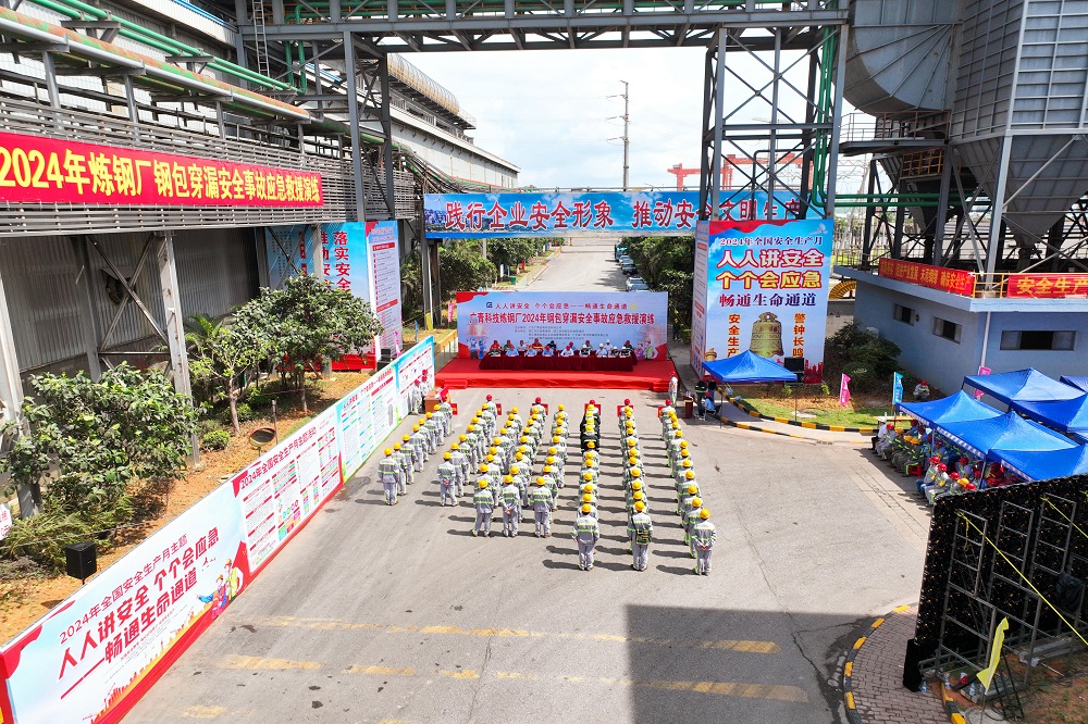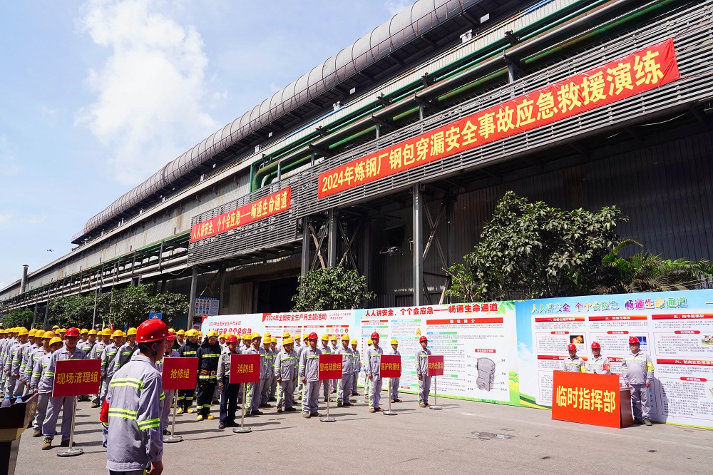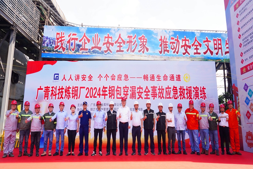 为深入学习宣传贯彻党的二十大精神和习近平总书记关于安全生产重要论述,全面落实“人人讲安全、个个会应急——畅通生命通道”的安全生产目标,进一步检验公司应急救援实战能力和应急救援队伍抢险战斗力,6月22日,广东广青金属科技有限公司在炼钢厂举行了2024年钢包穿漏安全事故应急救援演练。公司党委书记、董事长王骏,董事、总经理何丛珍等领导班子成员以及200多名员工代表参加演练。阳江市应急管理局总工程师谭丰华,阳江滨海新区应急管理局局长梁鸿武,阳江高新区消防大队、中国人保阳江分公司等相关单位领导到场观摩指导。